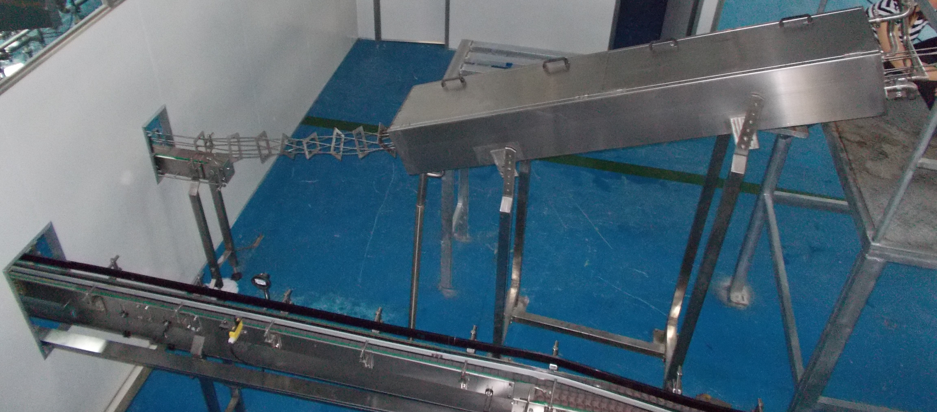 يتم نقل جميع الزجاجات إلى كل آلة بواسطة نظام ناقل. جميع أنظمة خط الإنتاج مرتبطة بنظام الناقل. SS نقل الحزام الناقل ضروري لنقل الزجاجات الزجاجية من أجل توسيع نطاق حياة الحزام.